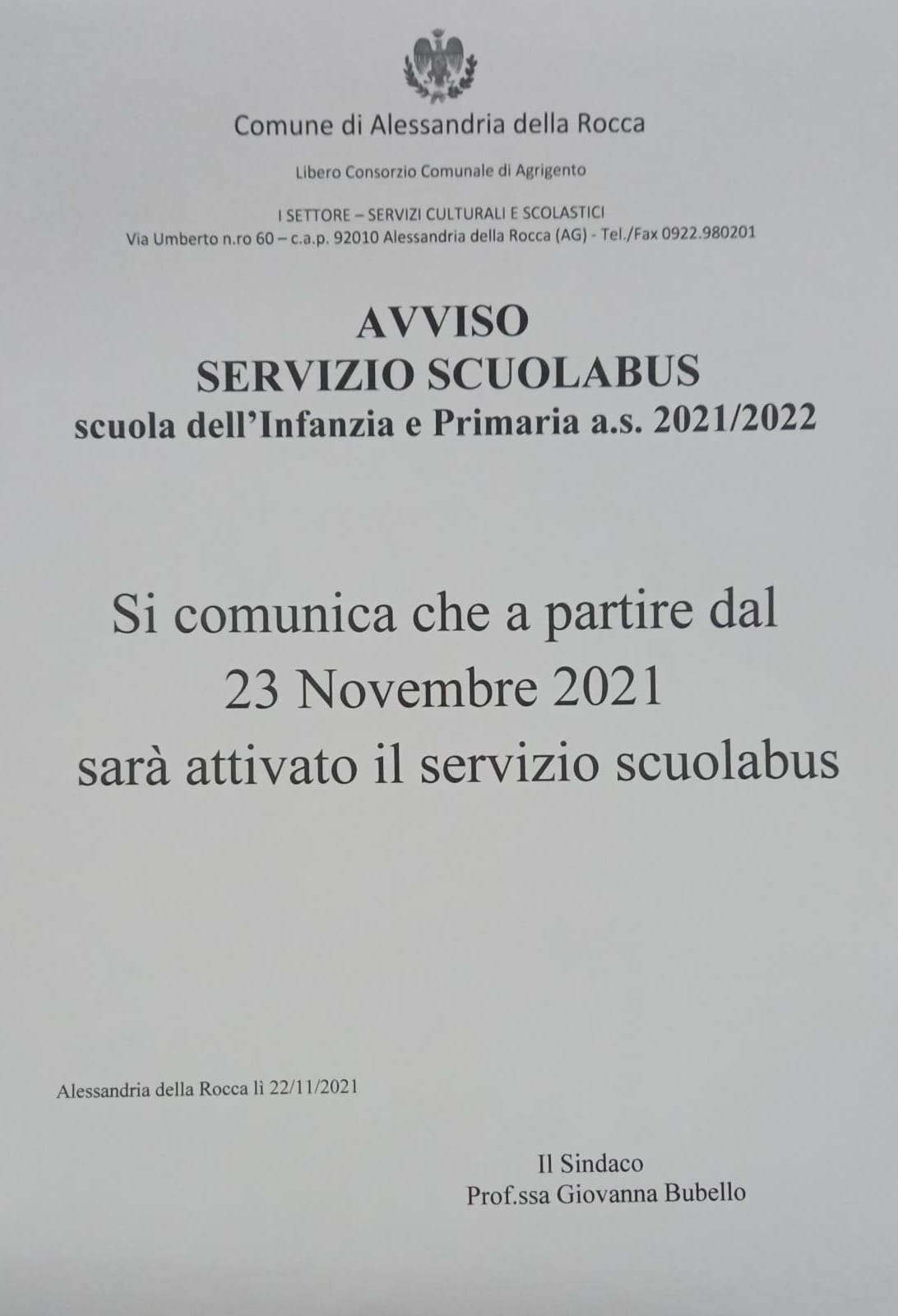 AVVISO - INIZIO SERVIZIO SCUOLABUS IL 23/11/2021