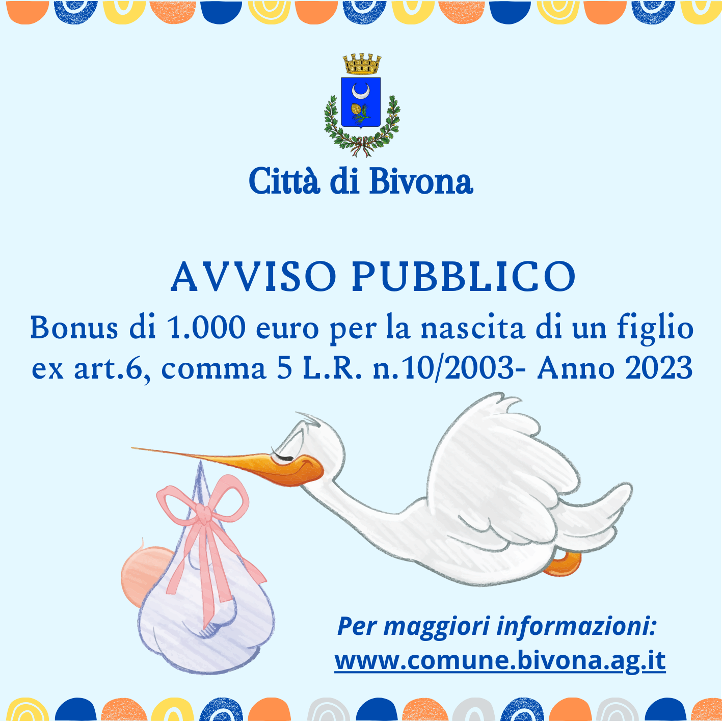 Che con D.D.G. N. 1980/S8 del 14.07.2023 IL DIPARTIMENTO REG.LE DELLA FAMIGLIA E DELLE POLITICHE SOCIALI, nei limiti dello stanziamento disponibile, pari ad € 1.443.709,12, prevede l'assegnazione di un BONUS di € 1.000,00 PER LA NASCITA DI UN FIGLIO, da erogare attraverso i comuni dell'Isola, sulla base dei parametri e dei requisiti qui di seguito stabiliti:
