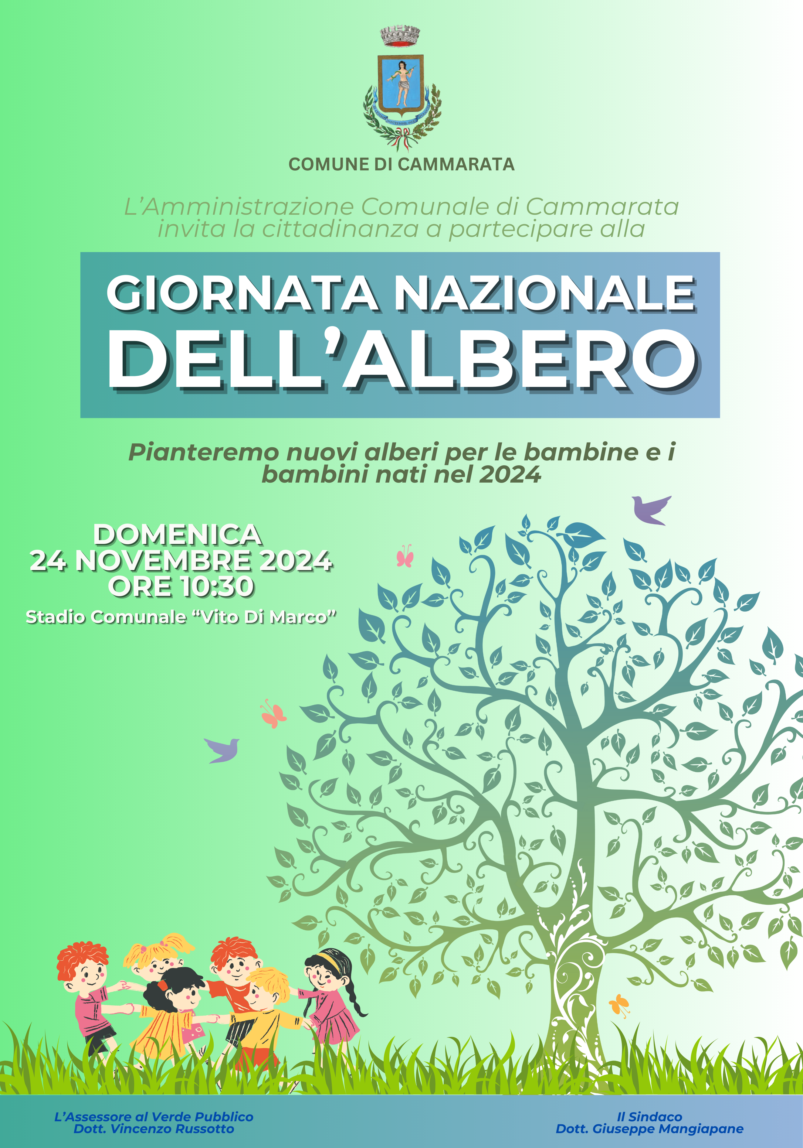 Anche l'Amministrazione Comunale di Cammarata, ha programmato per domenica 24 novembre 2024 alle ore 10.30 presso lo stadio comunale ”VITO DI MARCO” una manifestazione collegata all'iniziativa "Un albero per ogni nuovo nato e per ogni nuovo arrivato", con la piantumazione di tanti alberelli, quanti sono i bambini di Cammarata nati nel 2024 ed i nuovi arrivati .