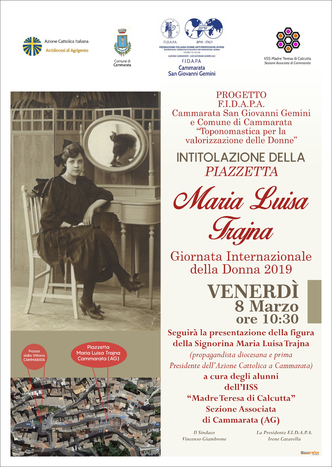 In occasione della giornata internazionale della Donna, l'8 marzo 2019, il Comune di Cammarata, su iniziativa della FIDAPA, intitolerà una piazzatta del centro abitato ad una donna cammaratese: la Signorina Maria Luisa Trajna. Sorella del fotografo Salvatore Trajna, ha dedicato la sua vita al sociale e alla educazione cristiana dei giovani del suo tempo, fu infatti la prima Presidente dell'Azione cattolica di Cammarata.