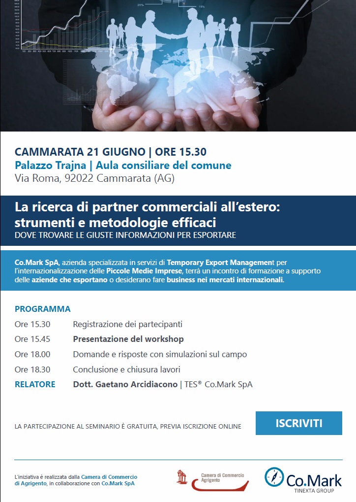 Organizzato dalla Camera di Commercio di Agrigento, si svolgerà presso l'Aula Consiliare del Comune di Cammarata, il 21 giugno 2019 alle ore 15,30, un seminario rivolto alle piccole e medie imprese, avente per oggetto "La ricerca di partner commerciali all'estero: strumenti e metodologie efficaci- Dove trovare le giuste informazioni per esportare". Relazionerà il Dott. Gaetano Arcidiacono. La partecipazione è gratuita. Si può procedere alla iscrizione on line attraverso questo LINK.