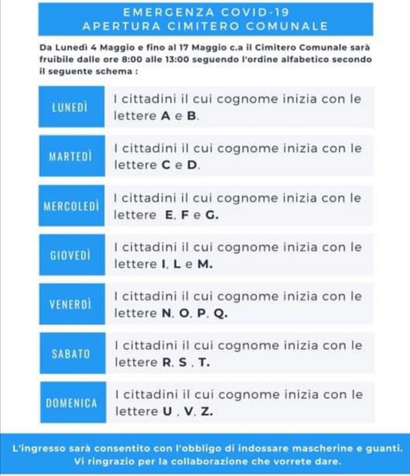 Il Sindaco, On. Vincenzo Giambrone, a seguito dell'ordinanza n. 18, art 7 del 30 Aprile 2020, del Presidente della Regione On. Musumeci, comunica l'apertura del Cimitero, come da tabella pubblicata in questo sito.