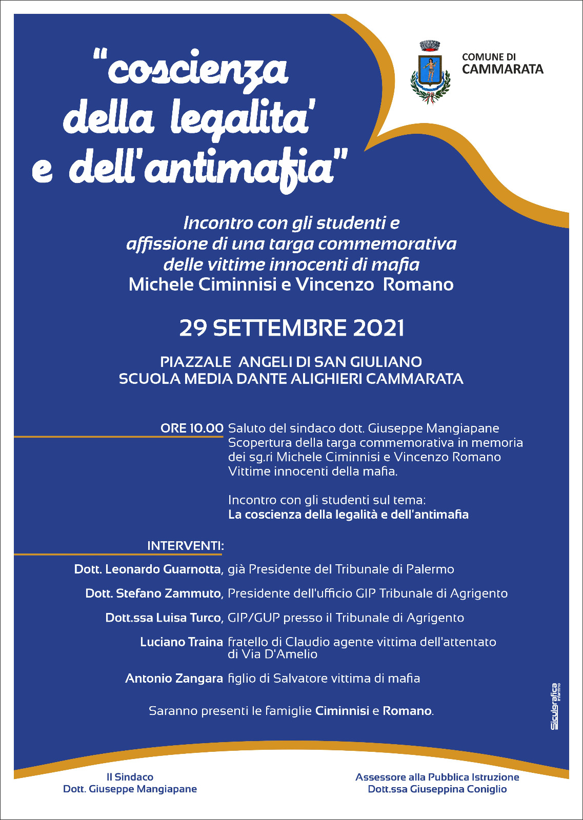 Mercoledì 29 settembre, alle ore 10 presso lo spiazzo “Angeli di San Giuliano – Scuola Media Dante Alighieri” di Cammarata, alla presenza del Sindaco Dott. Giuseppe Mangiapane e altre autorità, verrà scoperta la targa commemorativa in memoria dei signori Michele Ciminnisi e Vincenzo Romano, vittime innocenti di mafia.