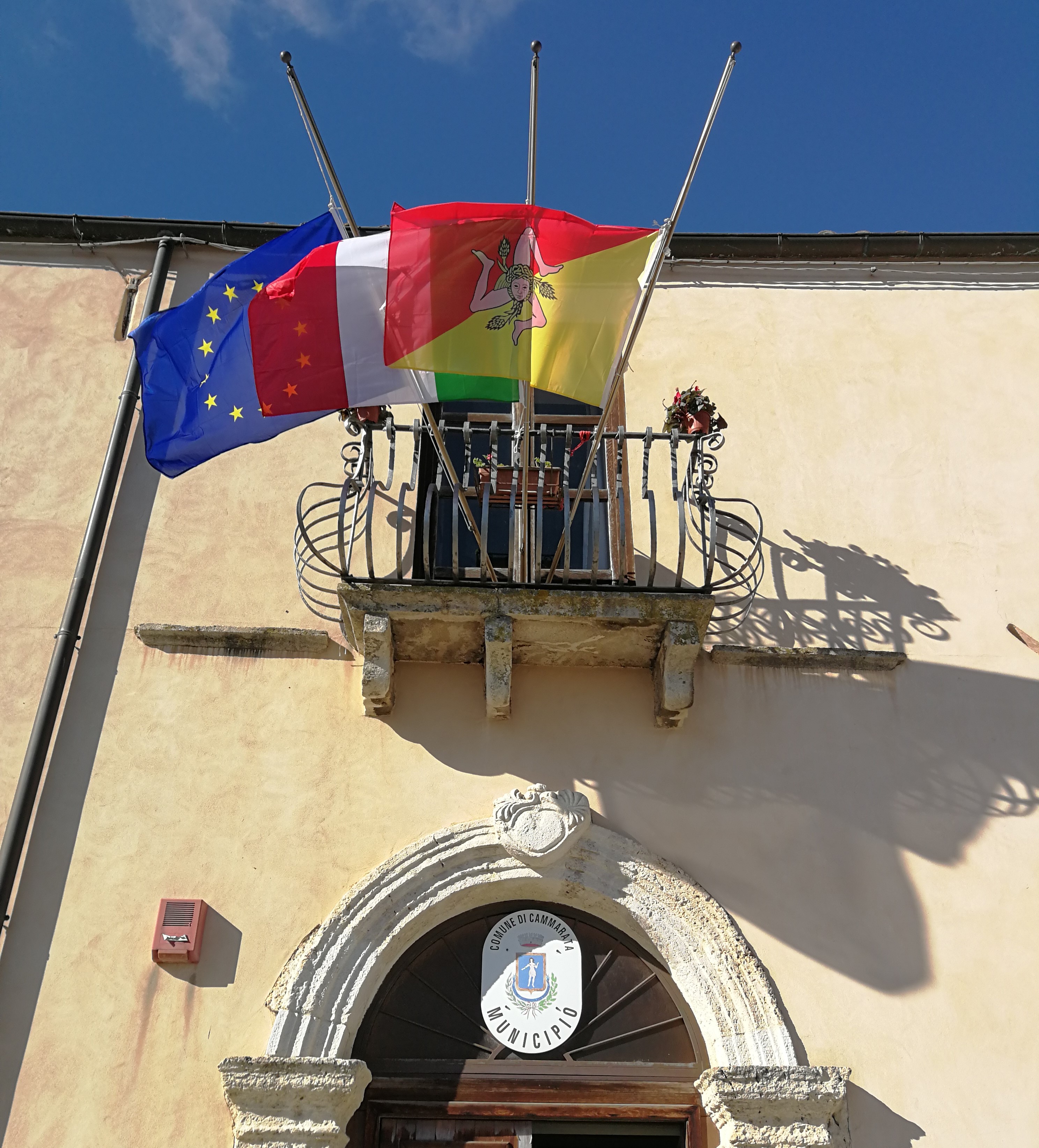 Bandiere a mezz'asta al Comune di Cammarata, nel giorno del funerale di Stato del Presidente del Parlamento Europeo David Sassoli.