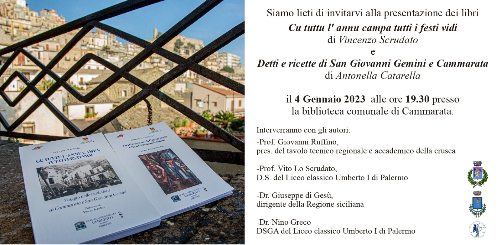 Si svolgerà , mercoledi 4 Gennaio 2023 alle ore 19,30, presso la Biblioteca Comunale di Cammarata la presentazione dei libri: