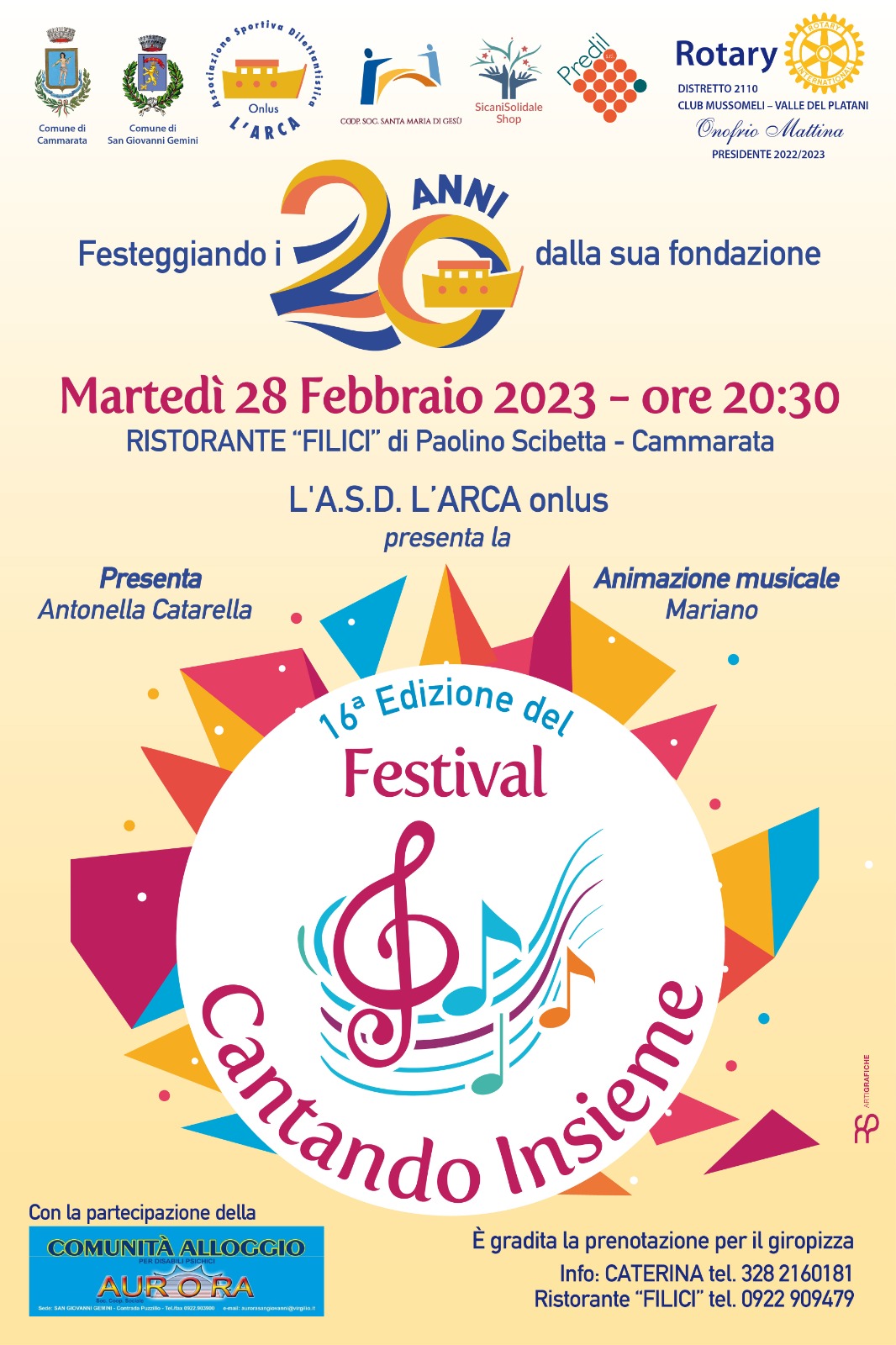 Caterina dichiara – Siamo lieti di invitarvi alla 16* edizione de Festival “Cantando insieme” , che si terrà presso il Ristorante Filici di Paolino Scibetta il 28 febbraio alle ore 20:30, e per festeggiare i 20 anni della nostra Associazione. I nostri ragazzi di esibiranno in performance canore e di ballo. Quest'anno sarà ancora più speciale perché a breve si inaugurerà il Centro Diurno La casa di Stefy presso la nostra sede di S. Maria completamente ristrutturata e senza barriere architettoniche con la messa in opera di un ascensore esterno.