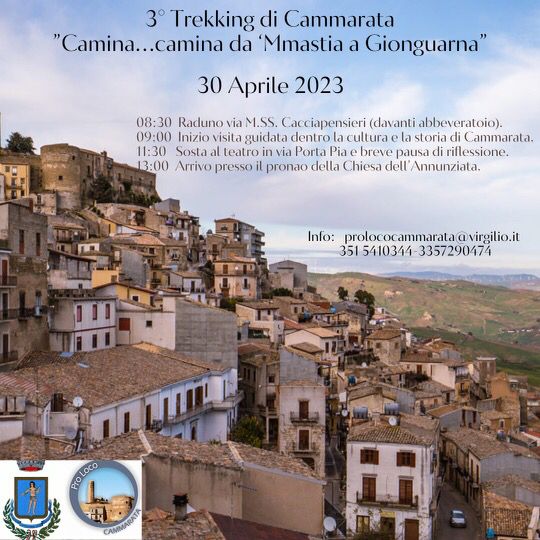 Domenica 30 Aprile , l'Associazione Proloco con il patrocinio del Comune di Cammarata ha organizzato il 3° Trekking di Cammarata . Verrà proposta una lunga passeggiata che partirà dalla zona alta del paese fino a raggiungere la zona bassa.