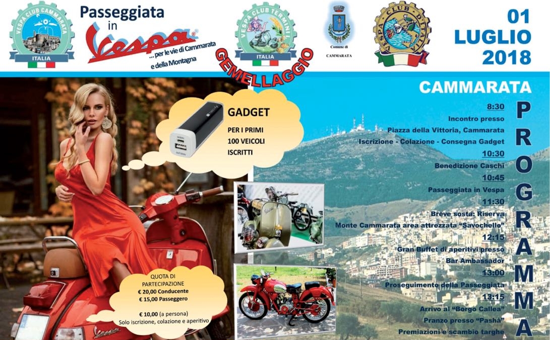 Domenica 1 luglio 2018 si svolgerà la manifestazione “Passeggiata in Vespa per le vie di Cammarata e della Montagna”. L’evento, è stato organizzato dall’ Associazione “Vespa Club Cammarata” con il libero patrocinio del Comune di Cammarata.
