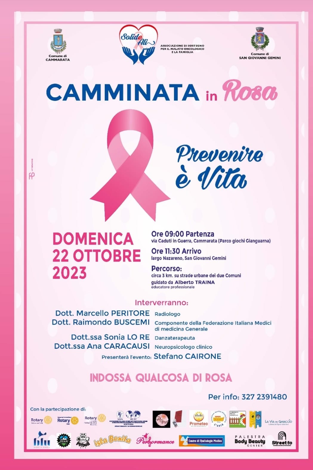 L'Associazione Solide Ali, presente nel territorio a sostegno dei malati oncologici, con il patrocinio del comune di Cammarata e di San Giovanni Gemini, ha organizzato la camminata non competitiva in un percorso di 3 Km circa su strade urbane dei due comuni per poi concludere la giornata con un convegno dove interverranno professionisti della medicina oncologica su temi di .