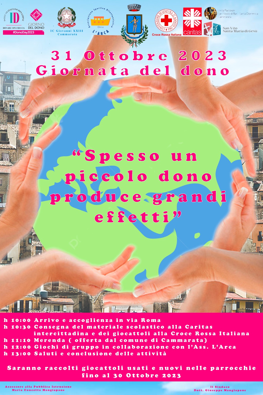 Il 31 ottobre c.a. a Cammarata sarà celebrata la Giornata del dono, l’Assessore Mangiapane M. Concetta e tutta l’Amministrazione Comunale hanno invitato le scolaresche che si raduneranno in via Roma dove l’Associazione Arca ed i giovani volontari del servizio civile organizzeranno dei giochi di gruppo, verrà consegnato per l’occasione il materiale scolastico e giocattoli alla Caritas intercittadina in segno di solidarietà. La giornata si concluderà con una merenda