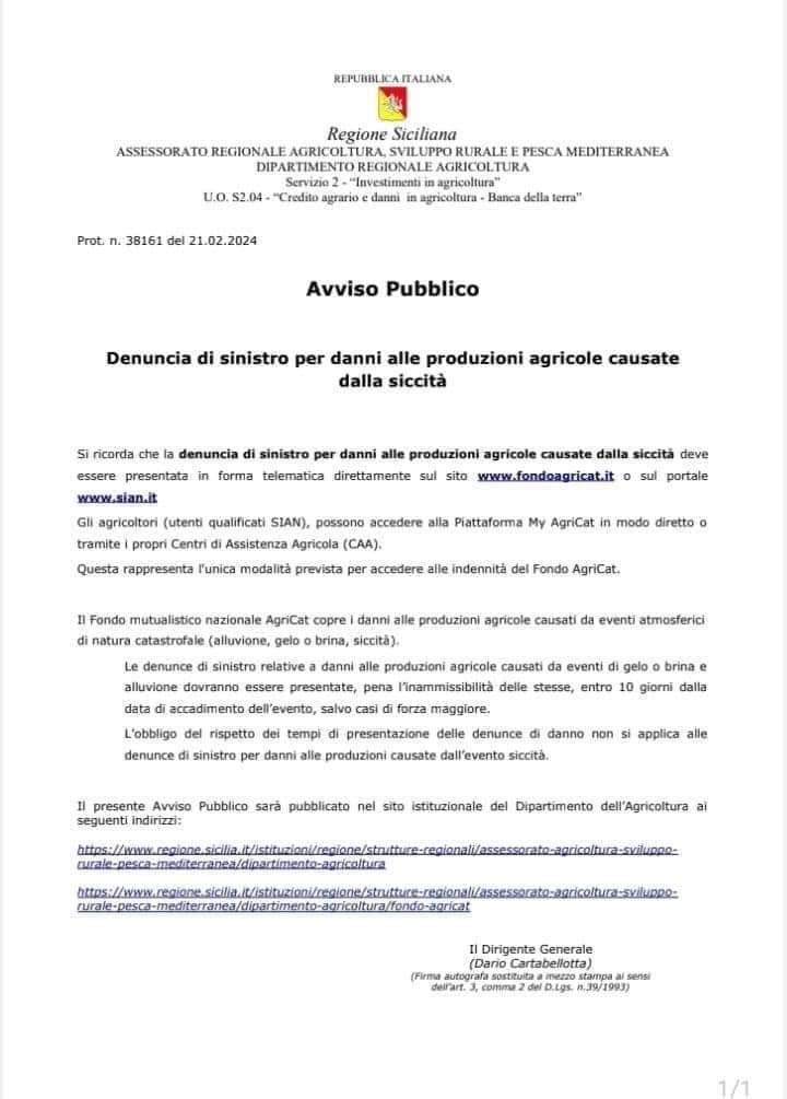 L'Amministrazione Comunale rende noto noto ai cittadini, che l'Assessorato Regionale per l'Agricoltura, Sviluppo Rurale e Pesca Mediterranea ha pubblicato un Avviso rivolto a tutti gli agricoltori che hanno subito dei danni a causa della siccità.Gli stessi possono presentare una denuncia di sinistro per danni solo in forma telematica, collegandosi al sito descritto nell'avviso