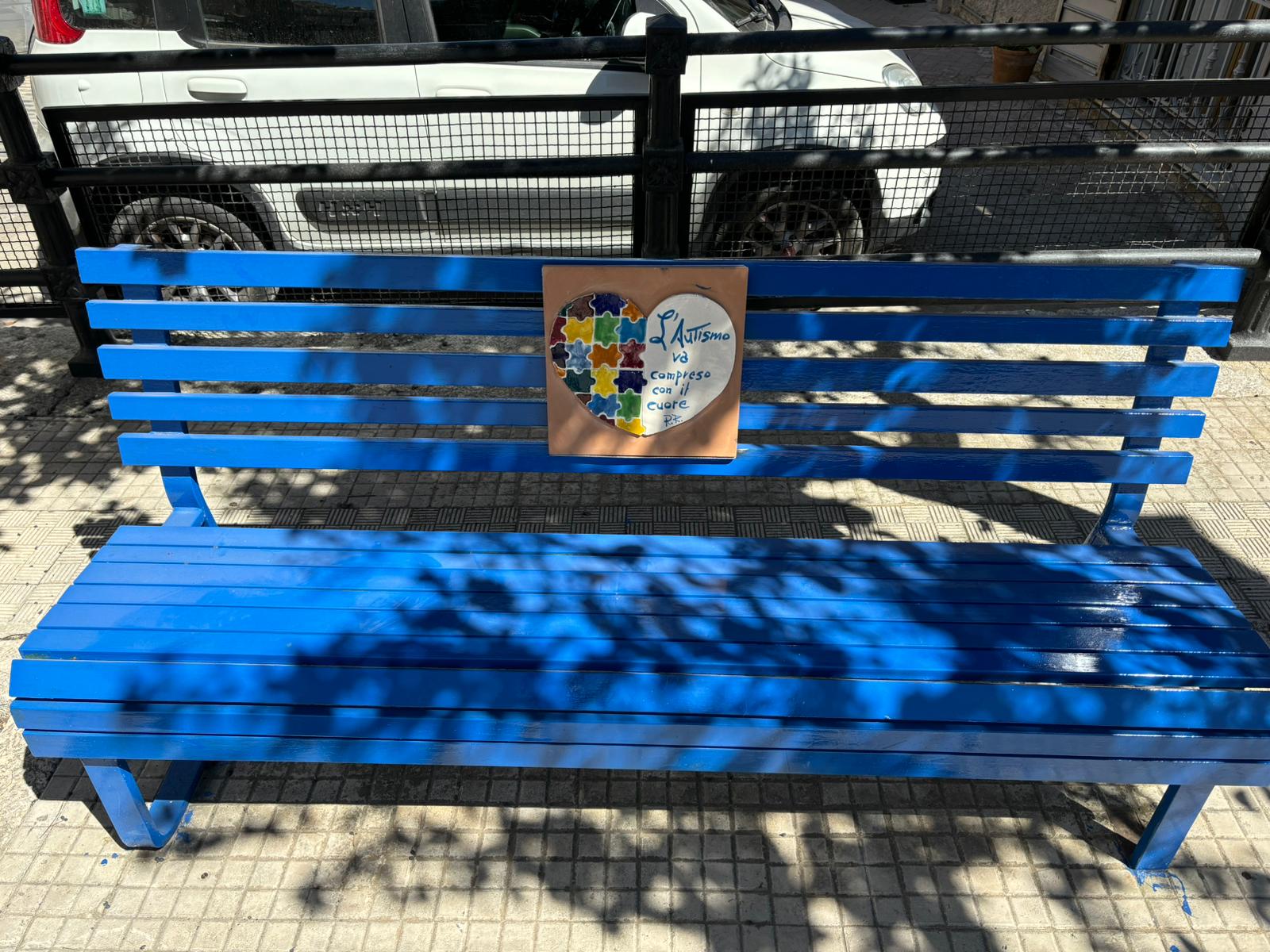 La panchina è stata realizzata artigianalmente dal maestro di arti visive Roberto Fragale, papà di Riccardo ,in occasione della Giornata della Consapevolezza sull’Autismo per porre l’attenzione sui diritti delle persone autistiche.