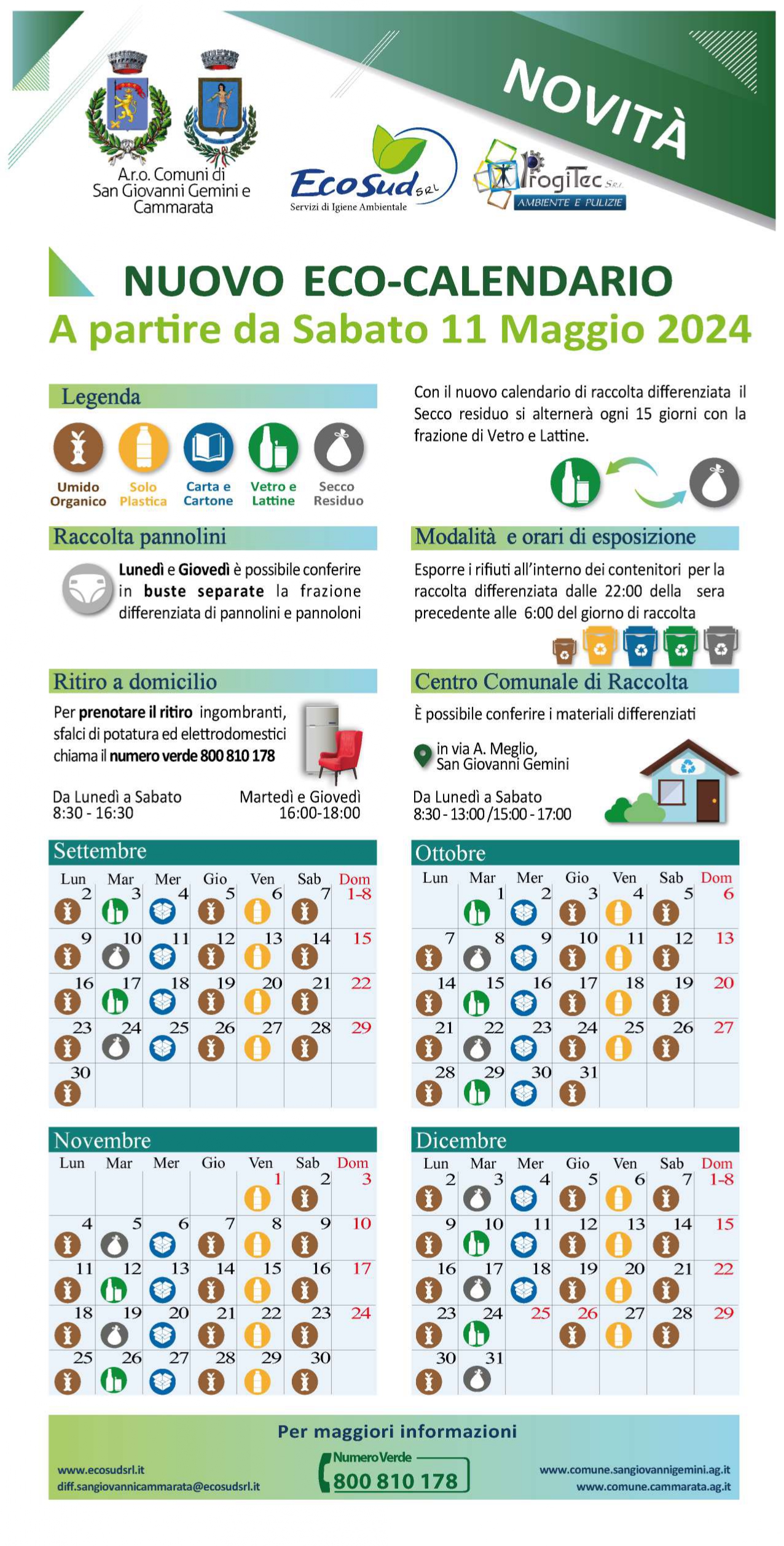 Nuovo Eco- Calendario in vigore a partire da Sabato 11 Maggio 2024
