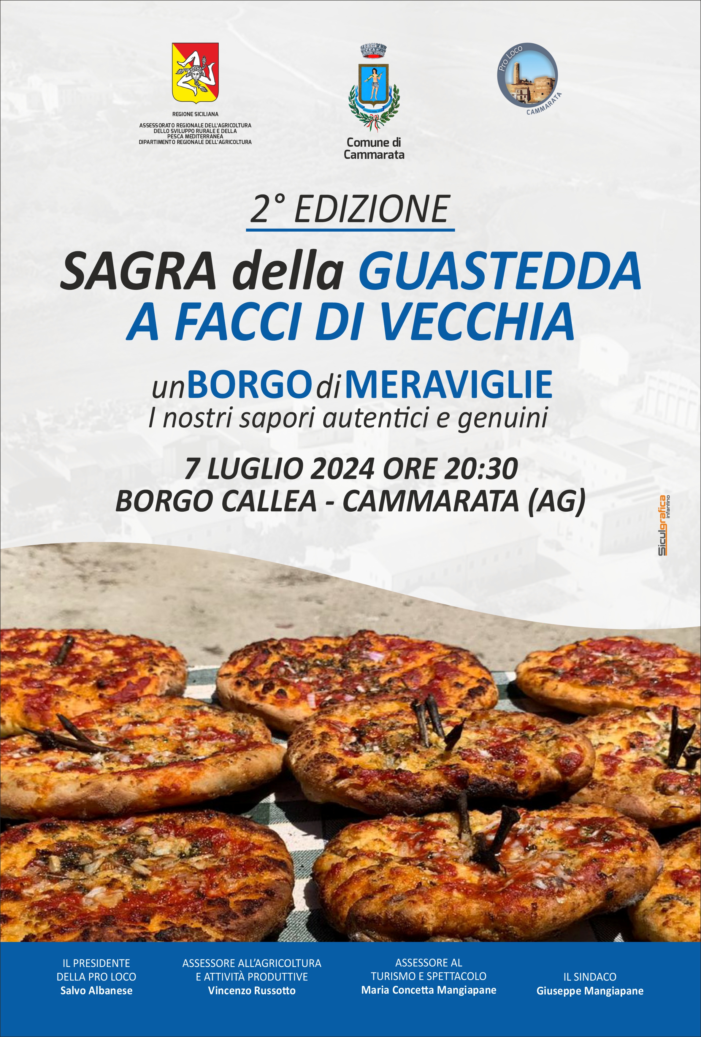 Parte la seconda edizione della Sagra della Guastedda a facci di vecchia, riconosciuta dal Ministero dell'Agricoltura e della sovranità alimentare e delle foreste tra i prodotti agroalimentari tradizionali. Il Sindaco e l'Amministrazione Comunale nell'obiettivo di promuovere e valorizzare il territorio, i prodotti e le attività imprenditoriali e agricole hanno predisposto il progetto " Un borgo di meraviglie – I nostri sapori autentici e genuini – Sagra della Guastedda a facci di vecchia edizione 2024.