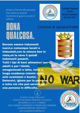 "Aiutaci a fornire alle persone che vivono in questo momento di guerra un pò di sollievo"- Luogo di raccolta Palazzo Palagonia, ingresso Piazza Duomo, nei giorni 4, 5, 8, 11, 12 Marzo.