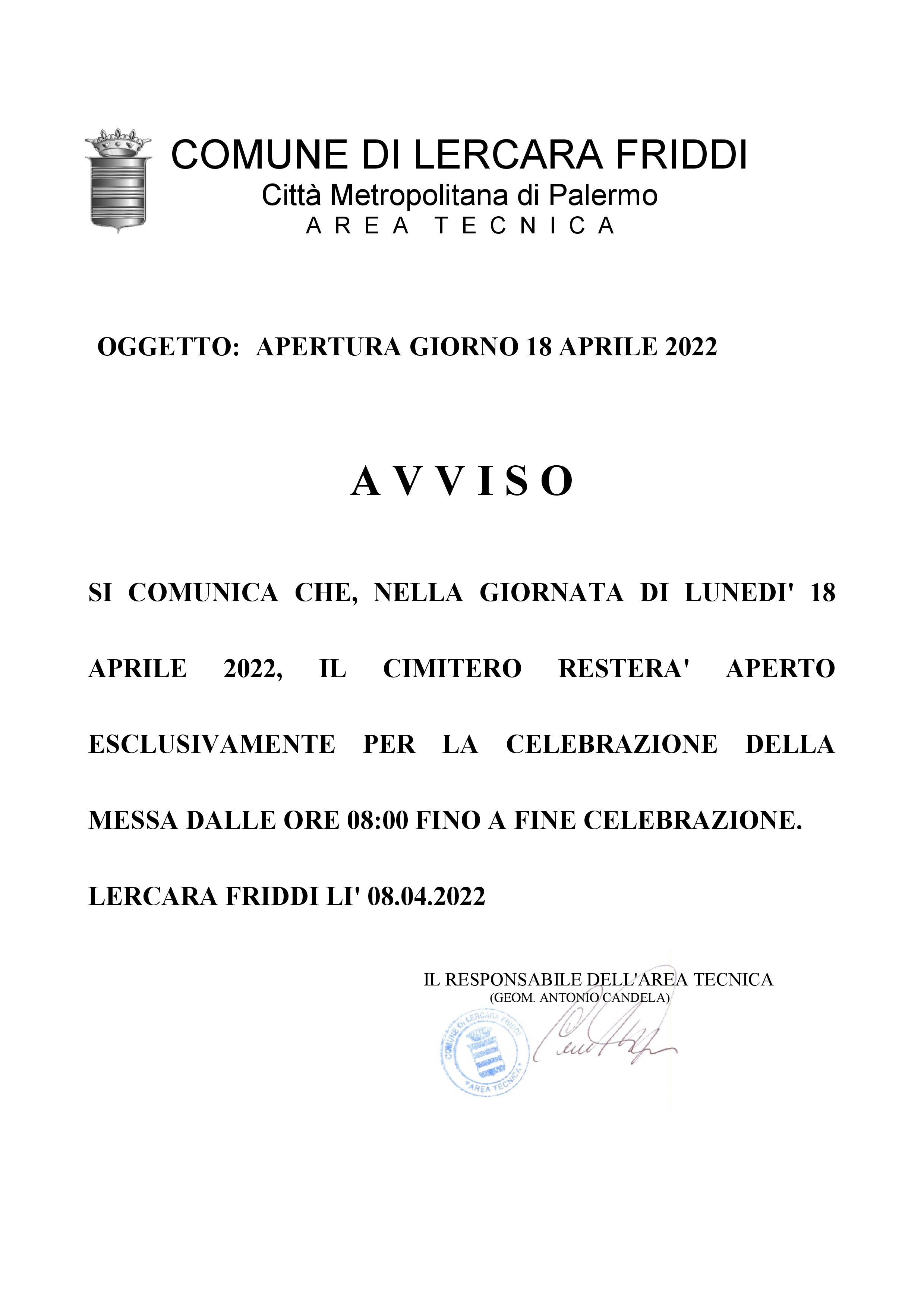 Si comunica che nella giornata di Lunedì 18 Aprile 2022, il cimitero rimarrà aperto esclusivamente per la durata della Messa dalle ore 08:00 fino a fine celebrazione.