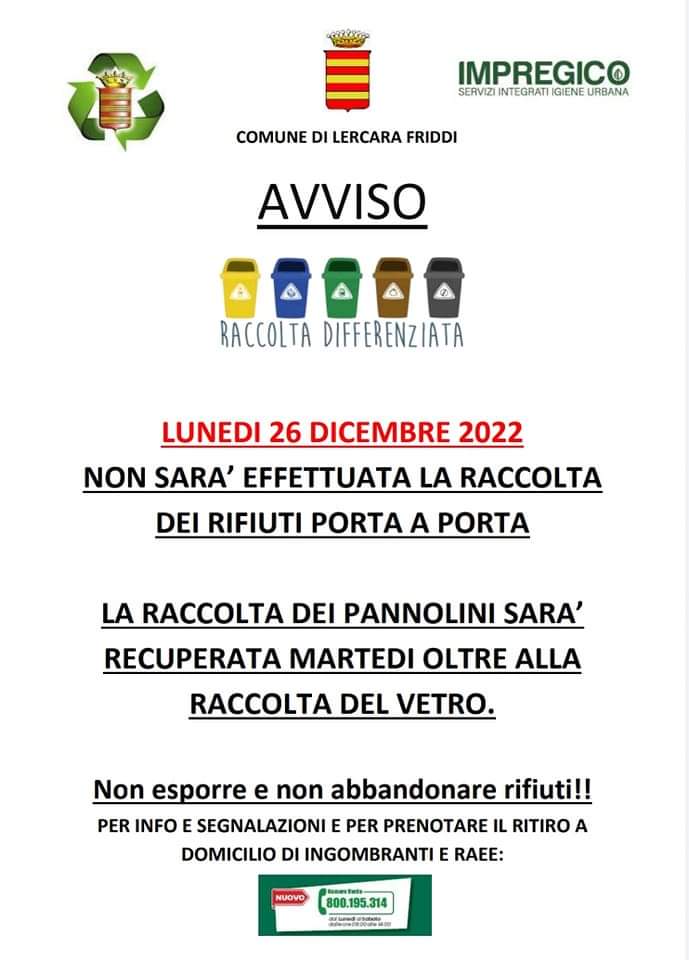 Lunedi' 26 Dicembre 2022 non sara' effettuata la raccolta dei rifiuti porta a porta.