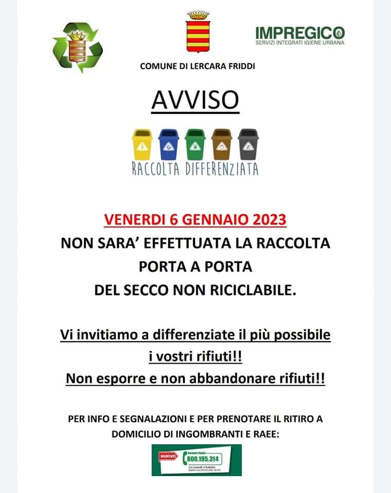 Venerdì 6 Gennaio 2023 non sara' effettuata la raccolta porta a porta del secco non riciclabile.