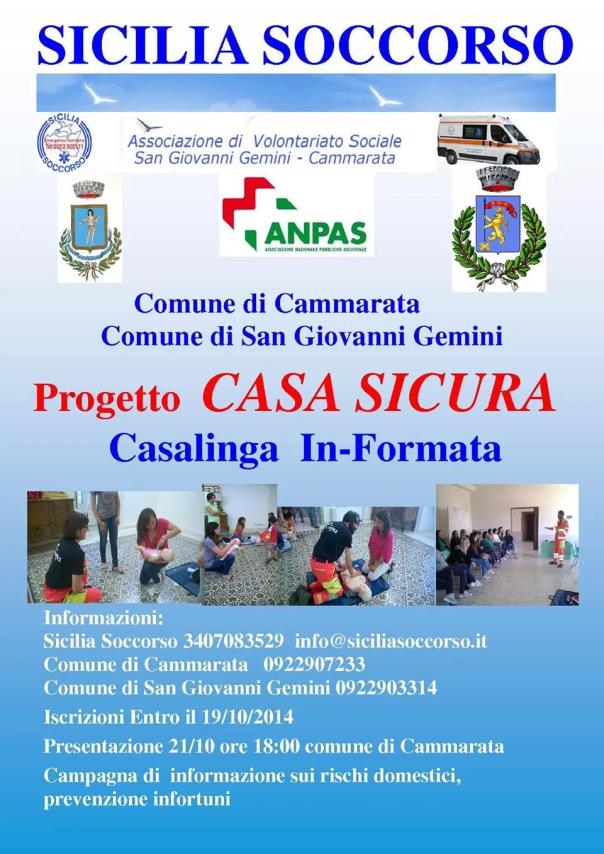 Il Comune di San Giovanni Gemini e il Comune di Cammarata, Sicilia Soccorso e Ampas, il 21 di ottobre alle 18:00, presso l'aula consiliare del Comune di Cammarata, presentano la "1° Campagna di informazione sui rischi domestici e prevenzione degli infortuni." Il programma del Progetto casa sicura-casalinga in-formata" prevede 5 lezioni di 2 ore ciascuna: