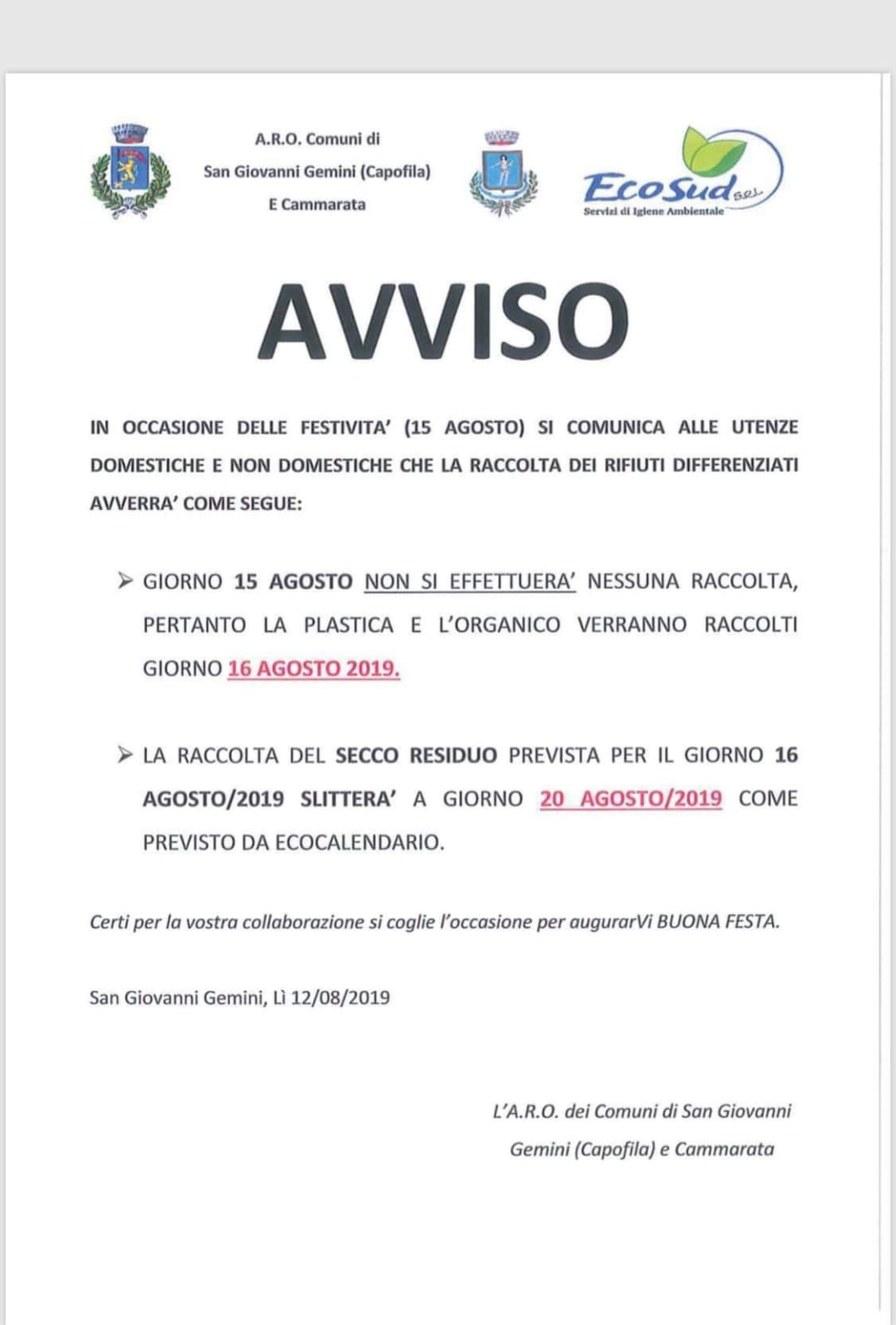 Raccolta differenziata nelle festivita di Ferragosto: ecocalendario ...apri
