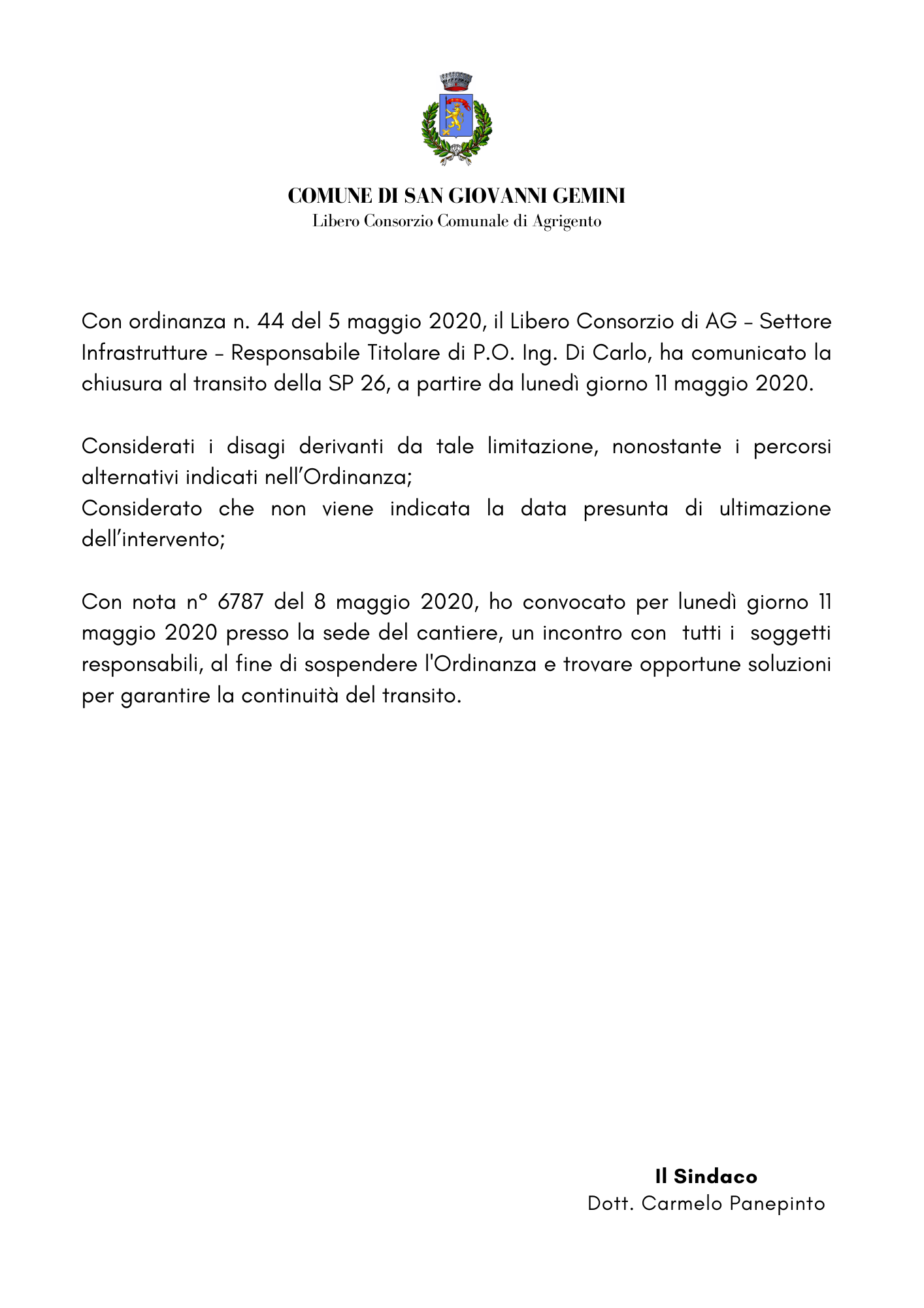 Ordinanza di P.O. di revoca della 43/2020 e indirizzo del traffico veicolare su percorsi alternativi.